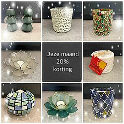 Deze maand krijg je 20% korting op alle kaarsen, kandelaars, waxinehouders en -lichtjes. Deze aanbieding brengt, in deze donkere dagen voor kerst, meteen sfeer, warmte en gezelligheid in huis. Wij verkopen o.a. Swazicandles, Amnesty kaarsen, dinerkaarsen en capiz waxinelichten.